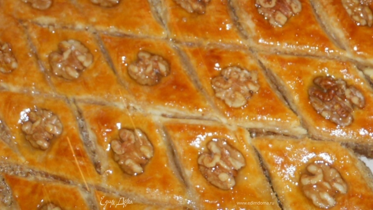 - Шаг 1На стол высыпать муку добавить масло и рубить. Потом добавлаем сметану с содой и желтки . Замешиваем тесто,которое делим на 3 равные части. Тесто кладём в холодильник на 1 час. Делаем начинку ,взбиваем белки,добавлаем сахар и орехи. Достаём наше тесто ,раскатываем и укладываем в смазаную маслом форму между слоями кладём начинку. Верхний слой мажем желтком и разрезаем на ромбики,украшаем половинкой грецкого ореха. Выпекать 30-40 минут ,при средней темпиратуре. Готовую пахлаву заливаем мёдом.