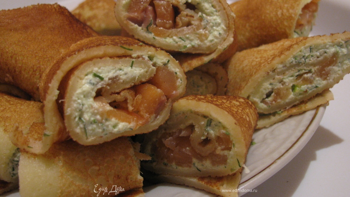 На днях мы смотрели с мужем "Званый ужин" и там один из участников готовил блинные роллы на закуску,мужу так захотелось таких роллов...Вот пришлось готовить.Я конечно немного изменила начинку,т.к. Филаделфию не нашла