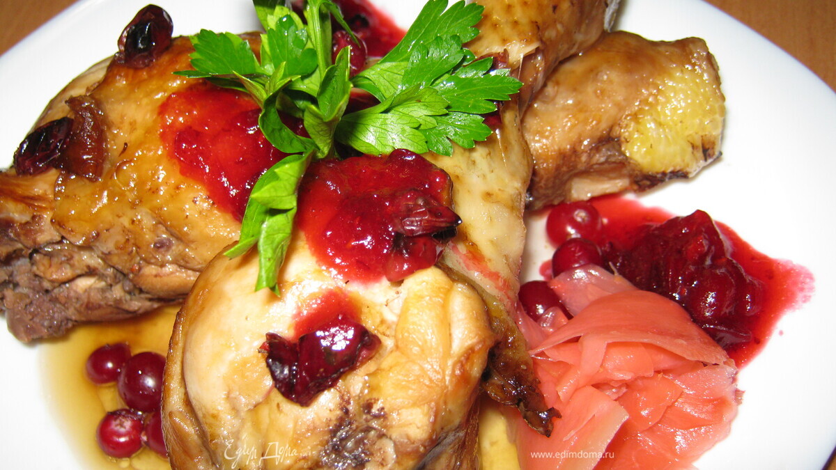 - Шаг 2Готовим клюквенный соус: давим в ступке клюкву, добавляем сахар, лимонную цедру и маленькую капельку оливкового масла. Отправляем на огонь, немного подогреваем, постоянно помешиваем и даем немного загустеть. Готовую курочку поливаем соусом. Приятного аппетита!!!