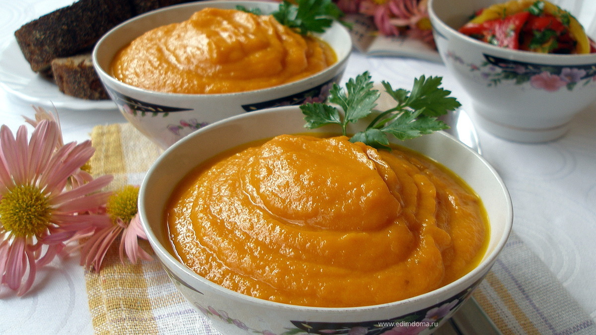 - Шаг 1Лук обжарить в оливковом и сливочном масле, добавить сушёный чили, чуть молотого кориандра, чеснок, мёд, тёртый имбирь. Морковь порезать кружочками, добавить к луку, чуть обжарить. Залить куриным или овощным бульоном, или просто водой. Варить до готовности морковки. Пюрировать.