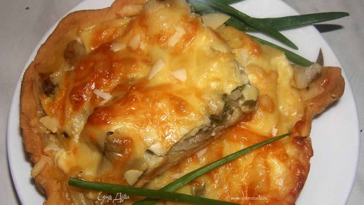 На полу готовый корж выложить полученную начинку. Сверху выложить полукольцами половину лука. Далее, посыпать укропом и зеленым луком, натереть адыгейский сыр. В миске смешать сметану,ст.л. муки и яйцо,. Полив пирог сметанной заправкой, посыпаем пармезаном.