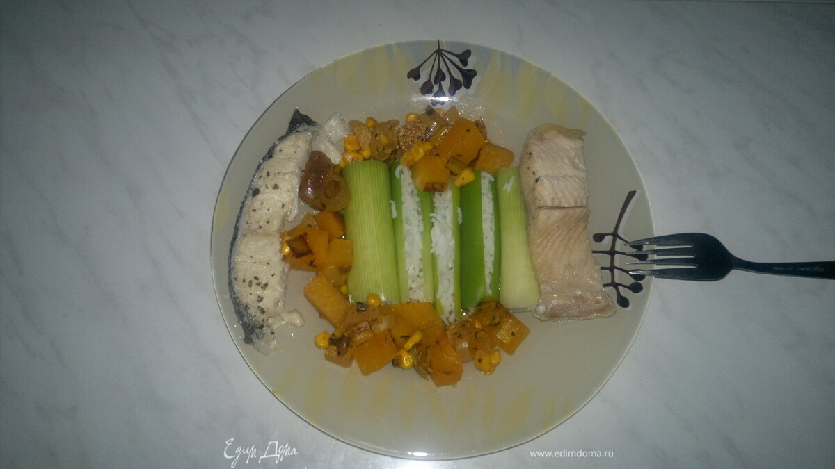 Трубочки из лука порей с рисом, остро-сладкий овощной чатни и два вида отварной рыбы