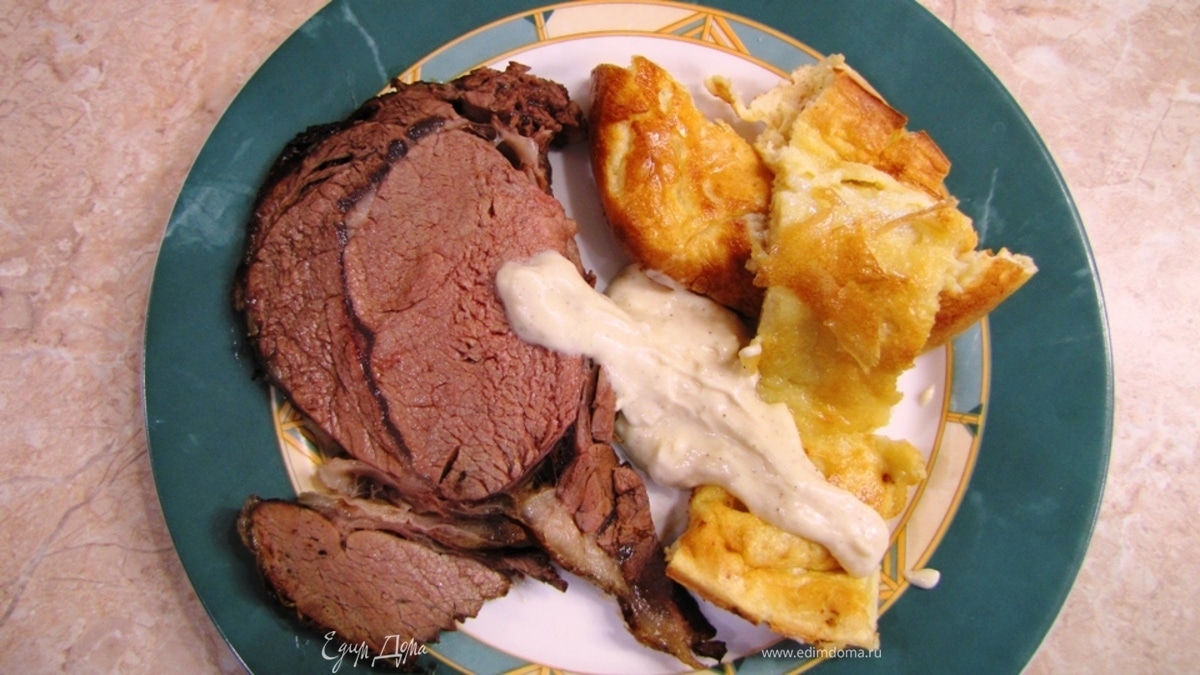Итак, я с радостью готов представить настоящий Английский Ростбиф По традиционному рецепту Ростбиф подается с Йоркширским пудингом и соусом из хрена. У меня, к сожалению хрена не было, поэтому я представляю блюдо с соусом Айоли.
