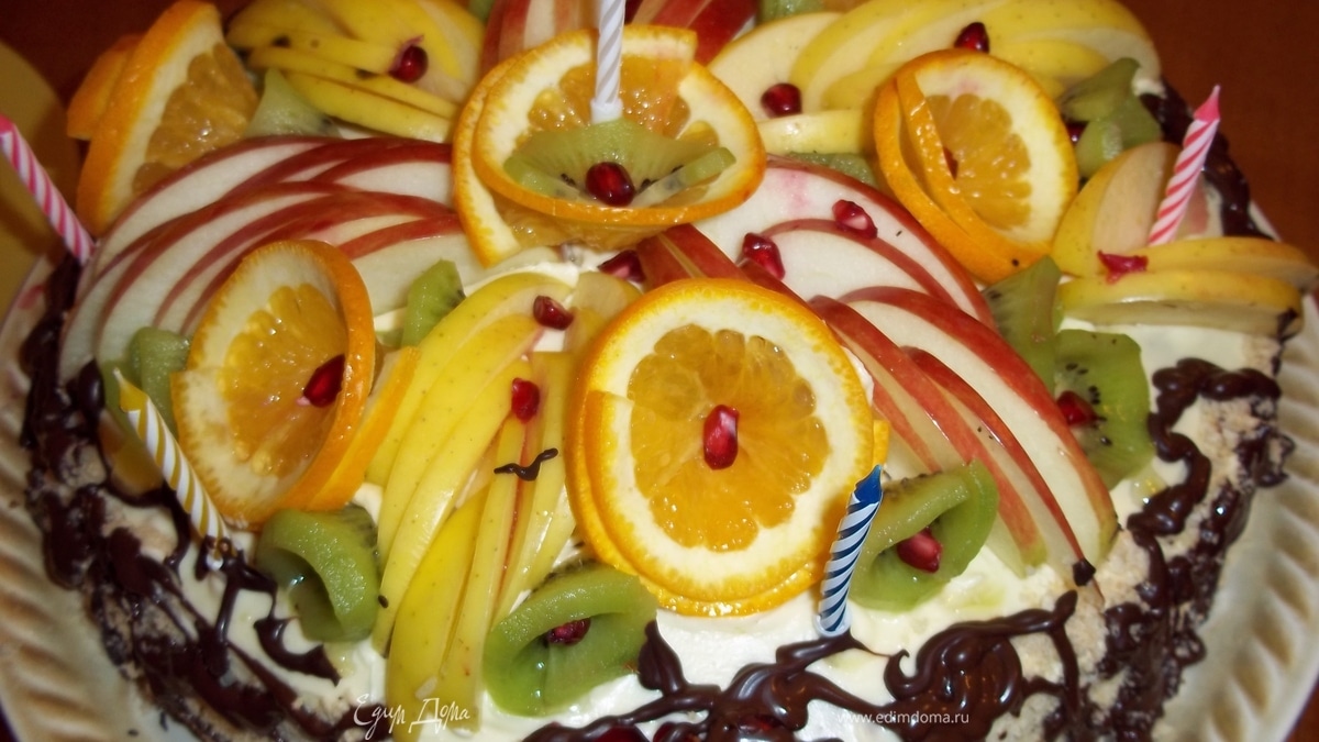 Украшение торта: Для этого я использовала нарезанные фрукты. А бока украсила помадкой, при помощи шприца. - Шаг 7