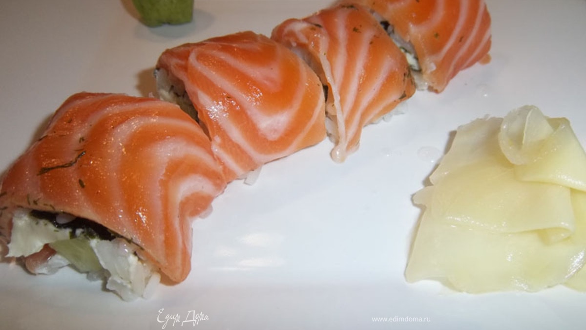 С помощью циновки свернуть в рулет, прокатав по столу. Сверху на рис выложить ломтики свежего филе лосося, нарезанное толщиной около 5 мм. Еще раз завернуть в циновку. Пододвинув ролл к краю циновки, выровнять его края с помощью пальцев. Плотно прижать циновку, чтобы ролл не распадался. - Шаг 4