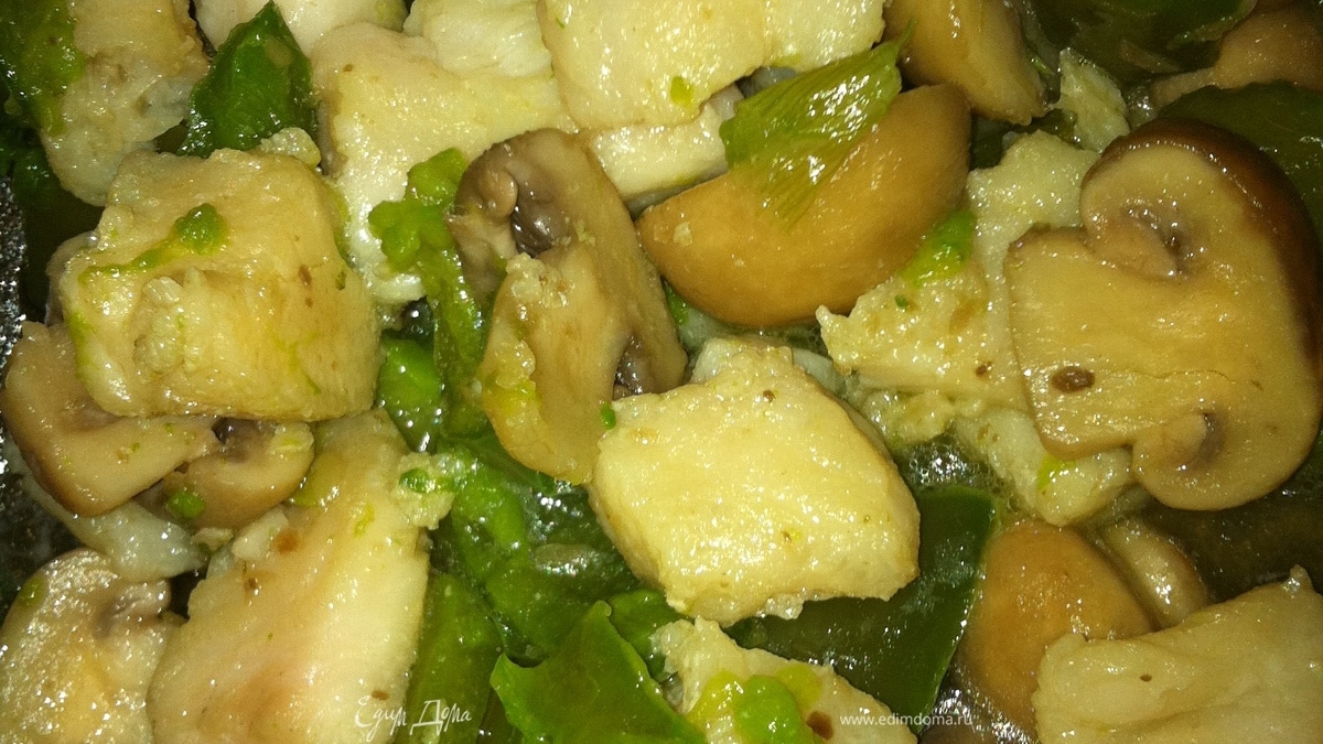 - Шаг 2В чистой сковороде разогреть масло и обжарить имбирь.Добавит зеленый лук, перец,грибы.Посолить и жарить 2 минуты.