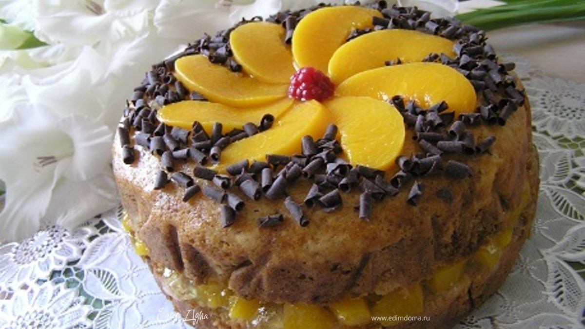 Аккуратно достать из формы, украсить по желанию. Я промазала верх торта мятным сиропом, выложила персики и посыпала шоколадной стружкой. Приятного аппетита! :)