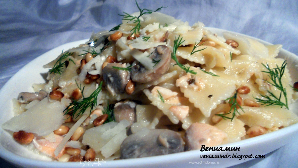 Паста с семгой, шампиньонами и кедровыми орехами