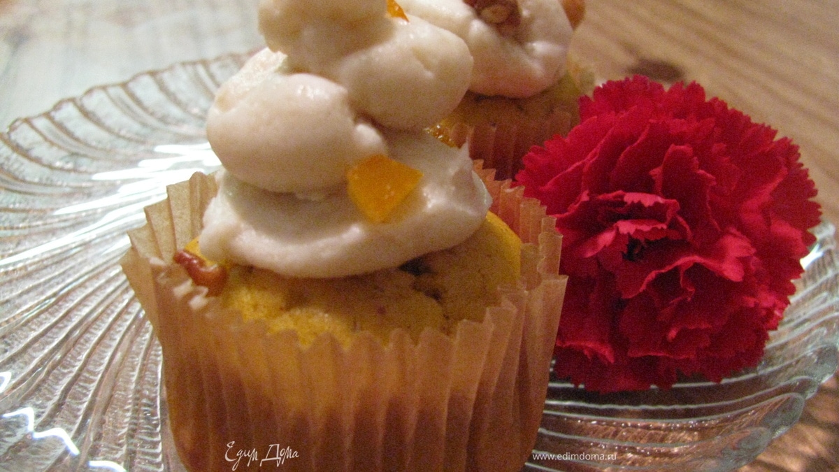 Дать кексам немного остыть. Для крема смешать сир из сахарной пудрой, украсить цукатами и орехами.