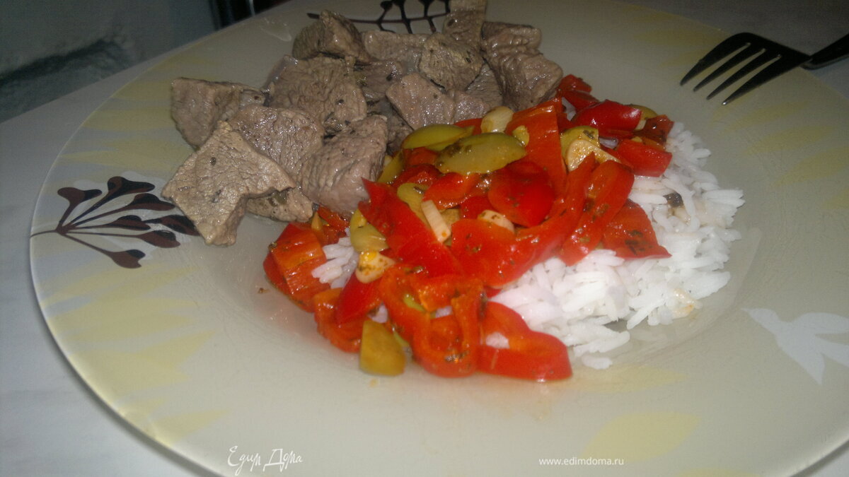 Белый рис с овощным рагу и мраморная говядина в традиционных французских специях.