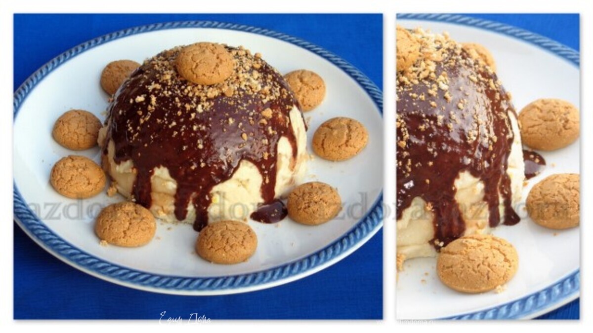 Через час достать пудинг, перевенуть его на блюдо и украсить по вкусу.Я растопила на водяной бане немного шоколада с каплей сливок и полила десерт. Раскрошила сверху одно миндальное печенье.Украсила по кругу миндальным печеньем.