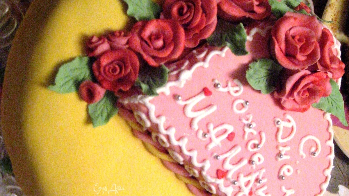 Торт обмазать масленным кремом и тоже обтянуть мастикой.Положить на верх торта сердце,украсить розами-их я лепила заранее и подкрашивала красителем.Надпись сделать кондитерским шприцом белковым кремом.Приятного Аппетита!