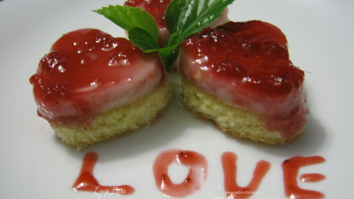 К оставшейся половине малинового пюре добавляем пару столовых ложек сахара и варим из него густое повидло. Остужаем и намазываем на суфле. Отправляем тортик на холод, чтоб загустело. Затем берем и вырезаем с помощью формочек пирожные. Приятного аппетита!