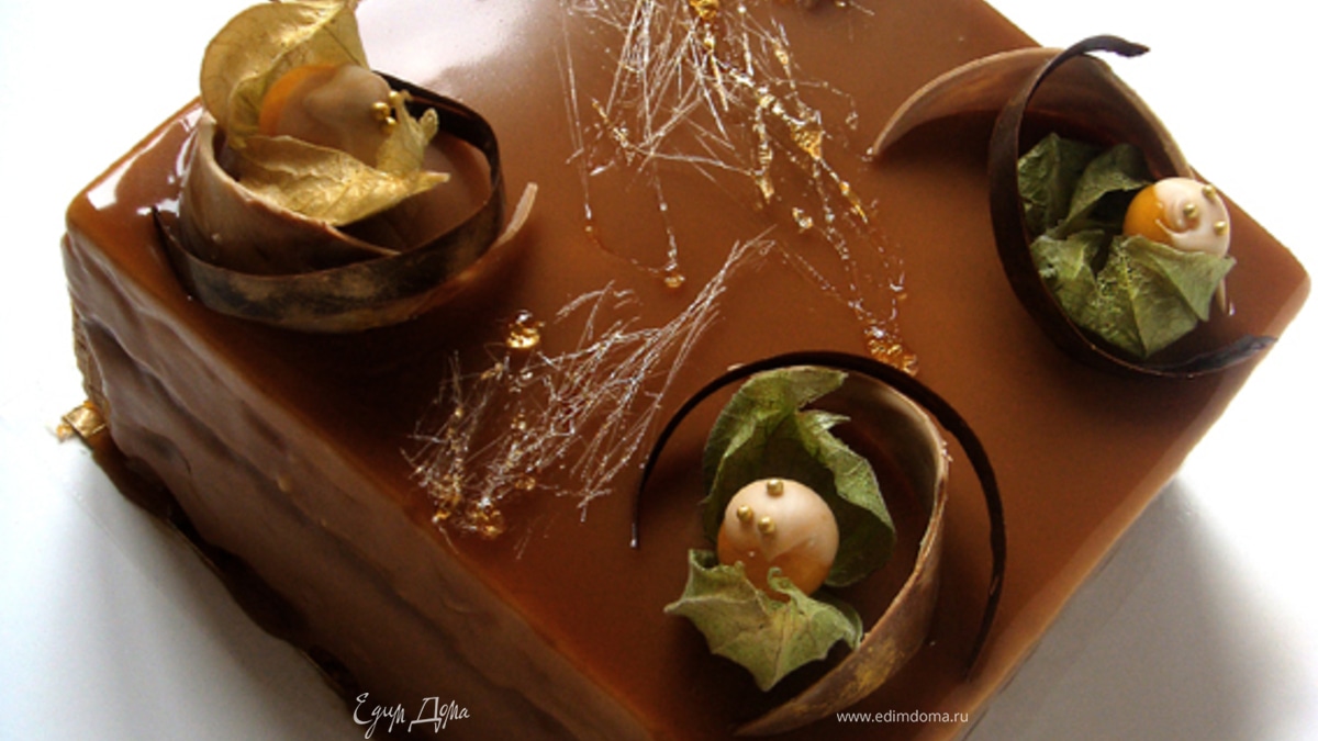 Глазурь тоже карамельная! Уварить сахар до карамели. Влить горячие сливки с молоком. Осторожно! Карамель на этом этапе очень сильно плюется. Остудить до 45-50C. Вмешать предварительно замоченный желатин(10гр). Дать остыть до комнатной температуры. Затем вылить на извлеченный из морозильной камеры торт(на решетке). Украсить по желанию шоколадными завитками и физалисом. Удачи!