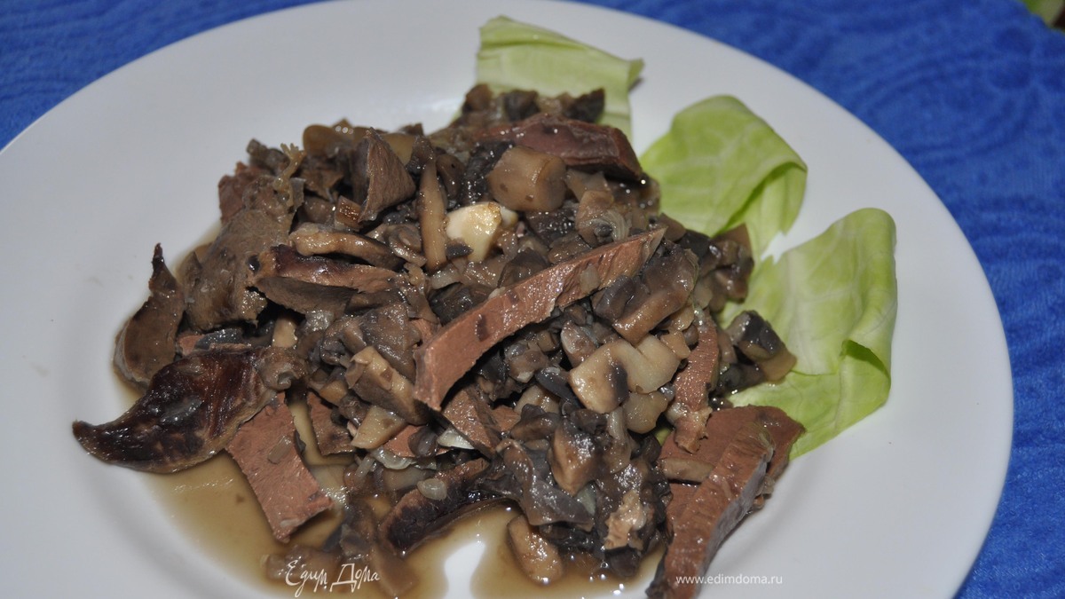 В чугунок налить масло растительное и в нем тушить лук с грибами, потом добавить сердце и вместе все ингредиенты варить 20-25 минут.Посолить, поперчить,добавить 2 зубка чеснока, 2-3 ложки сметаны. Вот и готово.