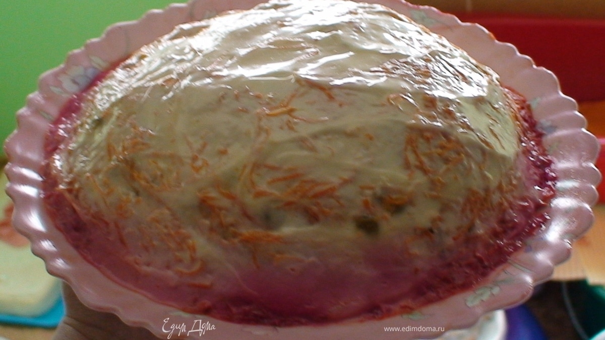 - ПодготовкаПриготовление по слоям: 1-й слой- свеклу потереть на тёрке + соль, майонез; 2-й слой- сыр на тёрку+ майонез с чесноком; 3-й слой- изюм; 4-й слой- сырая морковь на тёрку+ майонез. Дать настояться в холодильнике 1-2 часа. Перед подачей перевернуть форму с салатом на плоское блюдо, украсить измельчёнными грецкими орехами.