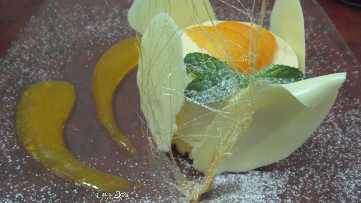 Вынуть из формы суфле, украсить шоколадом, дольками абрикос, карамелькой и мятой. Вокруг полить абрикосовым пюре. Приятного аппетита!