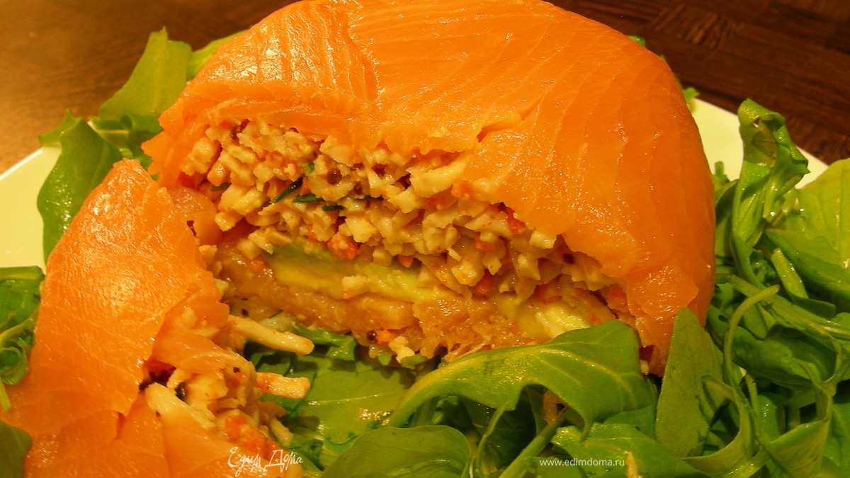 Закусочный шар из копченого лосося с крабовым мясом, авокадо и чили