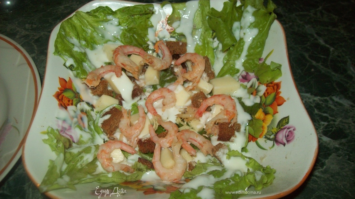 - Шаг 4В салатнике смешать листья салата с соусом, тертым сыром и сухариками. Выложить на тарелки, сверху положить креветки, посыпать натёртым пармезаном и кубиками сыра.