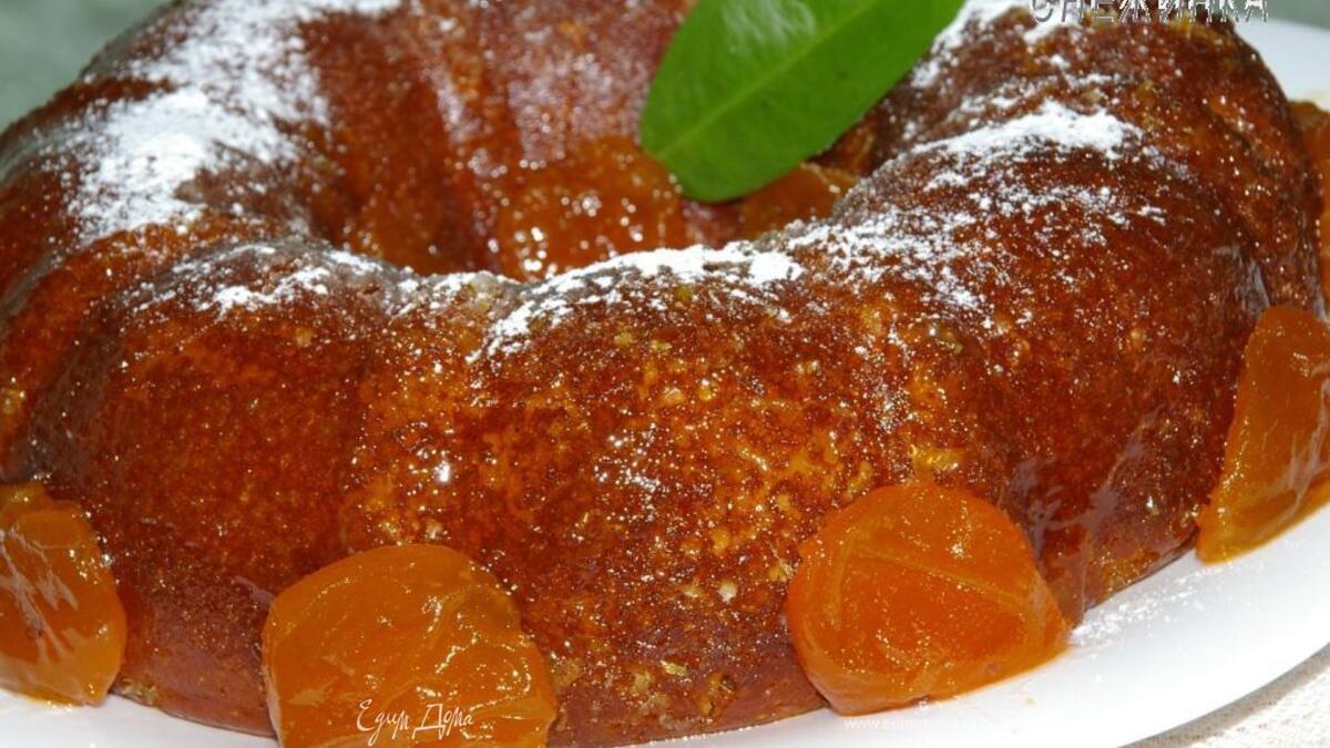 Абрикосы из сиропа выкладываем по краю саварена. Сверху присыпаем сахарной пудрой и украшаем листочками мяты, лимона или апельсина. - Шаг 19
