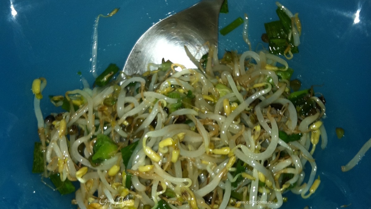 - Шаг 1В разогретой сковороде обжарить ростки и зеленый лук около минуты.Добавить соль и сахар, перемешать.