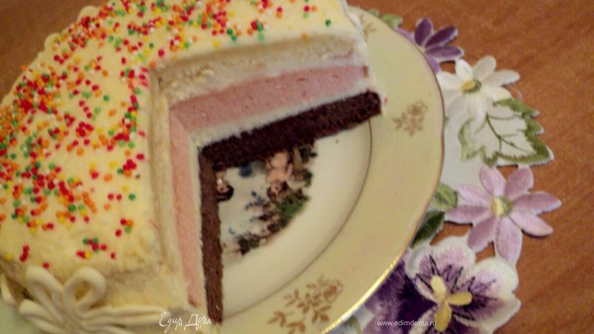 Осторожно вмешать маскарпоне во взбитые сливки, добавить распущенный желатин, перемешать. Коржи сложить друг на друга ( шоколадный, розовый, белый), смазывая каждый слой кремом. Кремом смазать бока и верх торта. Верх украсить разноцветной посыпкой, бока фигурками из белого шоколада. Поставить в холодильник на 1 час. Приятного аппетита! - Шаг 9