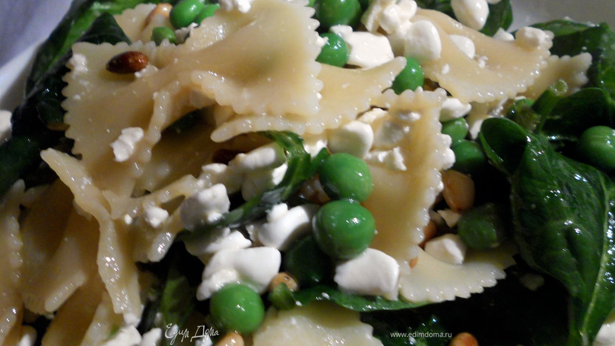 Теплый салат с пастой, горошком и творожным сыром