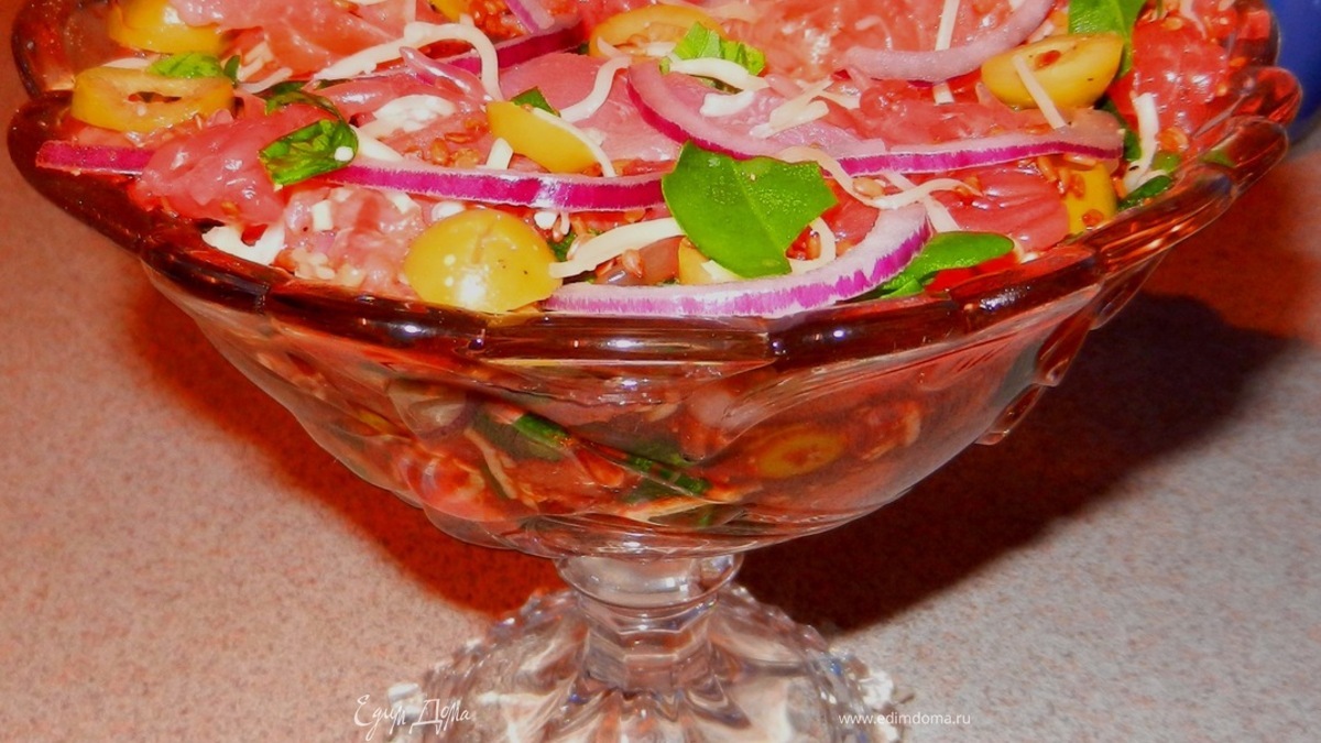 Освежающий салат с подкопченой семгой, грейпфрутом и оливками