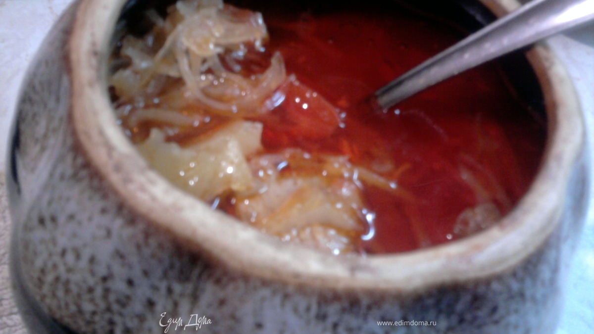 Пронечка,вот пришла:)Готов к отправке в духовку,горшочков у меня только два,по-этому пришлось использовать чугуночек еще.Одну порцию уже испробовал супруг(фото тоже сейчас добавлю уже готового борща),сказал:очень вкусно,вкуснее чем обычно,на плите когда готовлю.