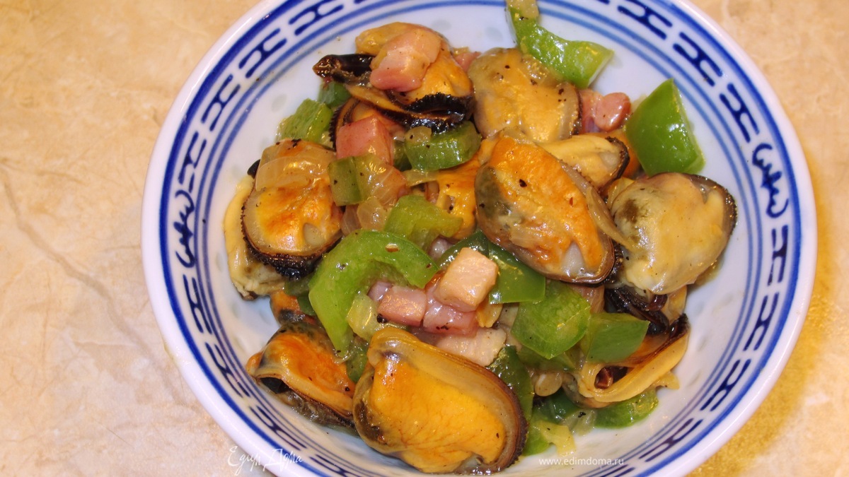 Итак. Режем мелко репчатый лук. Разогреваем пару столовых ложек растительного масла в сковороде на среднем огне. Обжариваем лук пару минут, постоянно помешивая. Кладем в сковороду порезанный кубиками бекон и сладкий перец. Обжариваем все еще три минуты, постоянно помешивая. Перец должен немного обмякнуть, но остаться хрустящим. - Шаг 2Предварительно размораживаем мидии. Мидии должны быть высушены (например при помощи кухонного полотенца). Сделайте огонь максимальным. Выложите мидии и обжаривайте все на сильном огне еще пару минут. Положите устричный соус, посолите. Сбрызните мидии лимонным соком. Выключите огонь. посыпьте черным перцем и еще раз перемешайте.