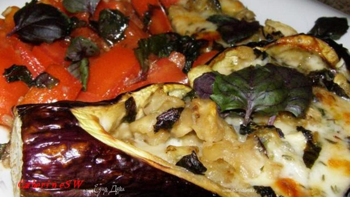 Баклажан, фаршированный сыром, с гарниром из помидоров