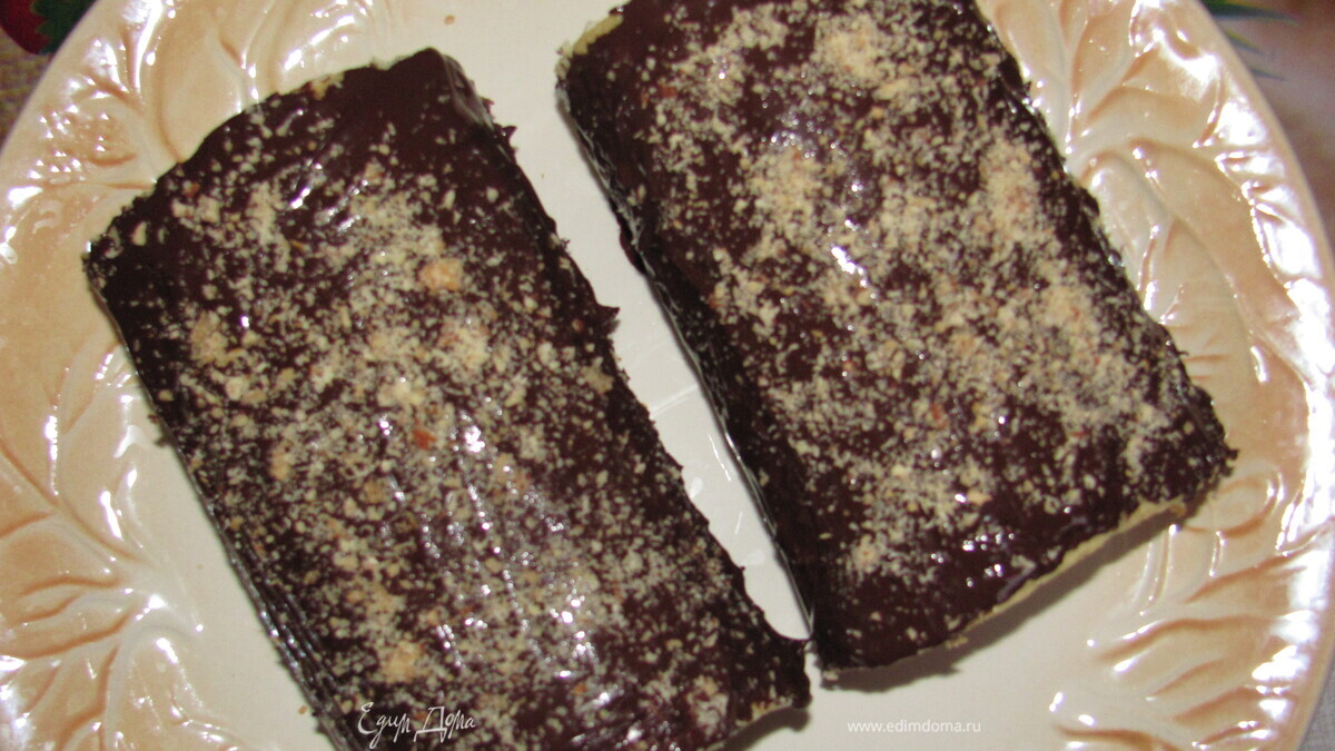Остывший корж развернуть, смазать его кремом и обратно завернуть. Сверху полить растопленным шоколадом и посыпать тертым миндалем. Поставить в холодильник на 4-5 часов.