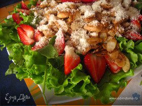 - ПодготовкаСмешать масло и уксус. Выложить салатные листья на блюдо и полить заправкой (масло+уксус) аккуратно перемешать, клубнику нарезать и разложить по листьям в произвольном порядке. Сверху раскрошить брынзу. Приятного аппетита.