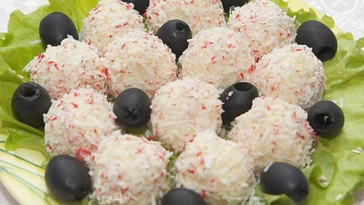 Рафаэлло из оливок,сыра и крабовых палочек
