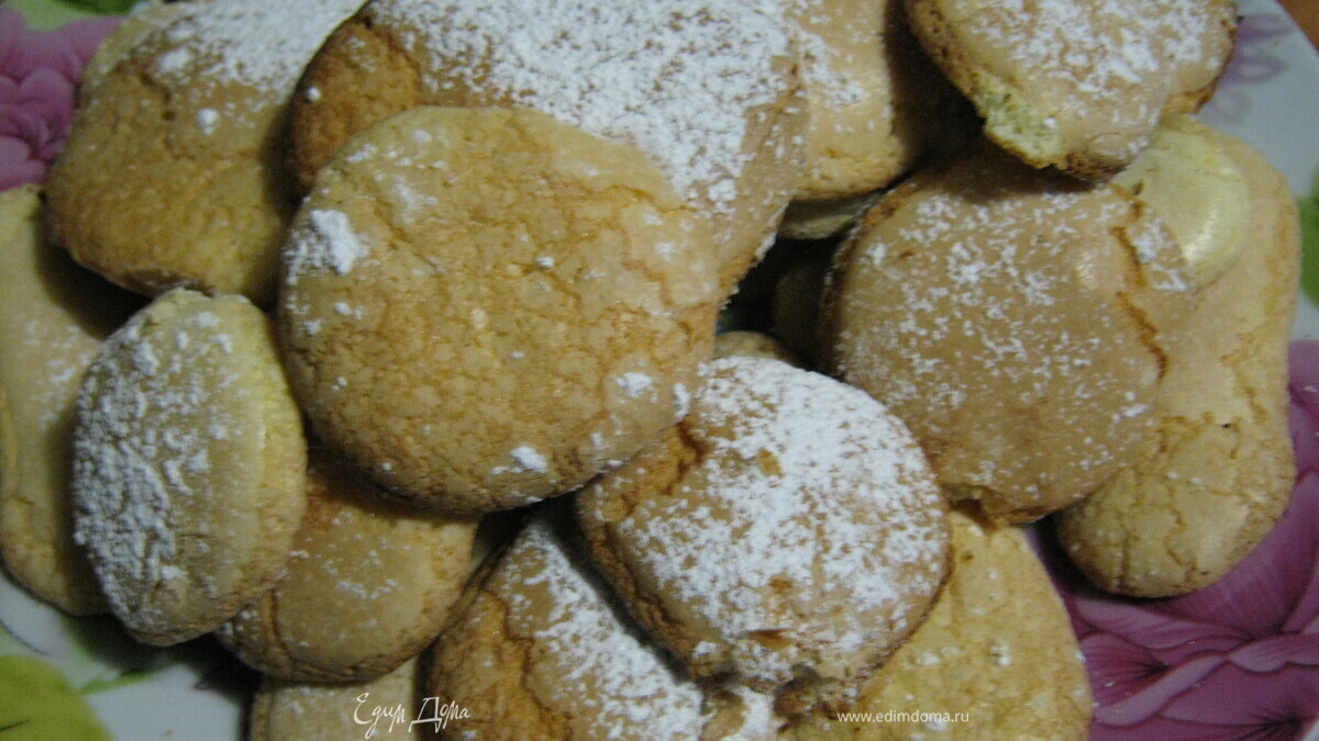- Шаг 1Разделяем белки от желтков. Белки взбиваем с 75г. сахара до образования устойчивых пик. Желтки также взбиваем с 75г. сахара, до тех пор, пока желтки не побелеют. Соединяем эти две массы , солим и добавляем муку. Хорошенько все вымешиваем. Тесто получается воздушным и нежным. Противень застилаем пергаментной бумагой, смазываем сливочным маслом и с помощью шприца выдавливаем тесто в виде кружочков. Выпекать 10-15 минут. Готовое печенье притрусить сахарной пудрой. Приятного чаепития мои дорогие)))))