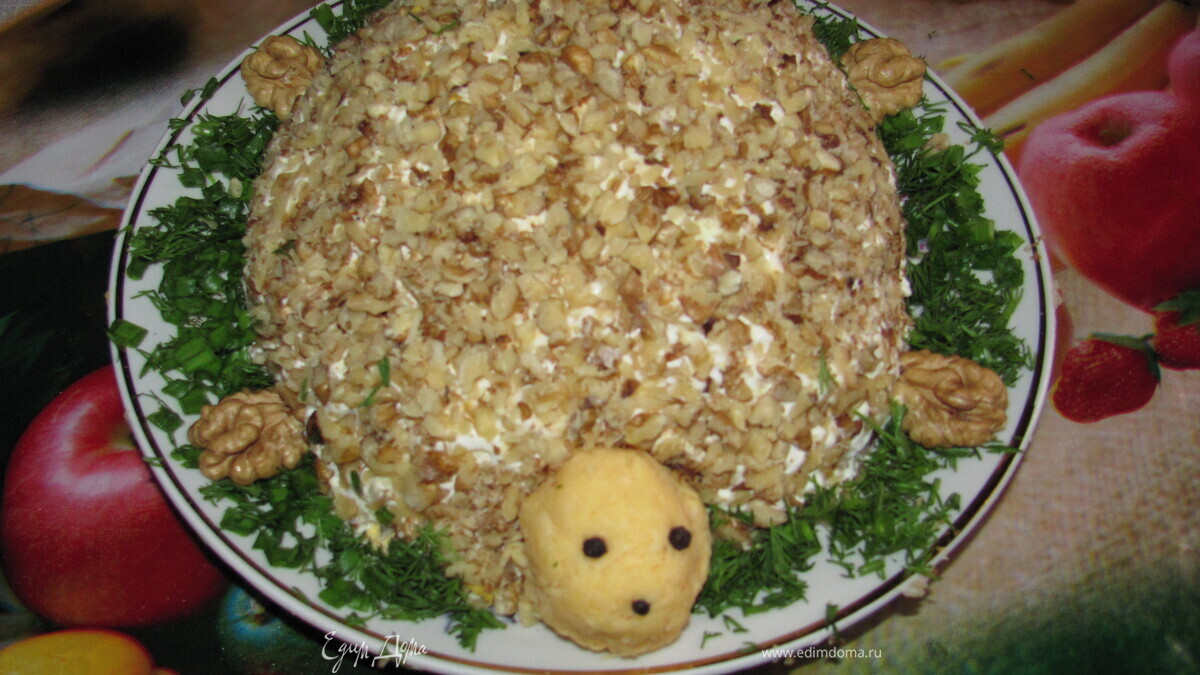 - Шаг 4Столовую ложку тертого сыра отложите, остальной сыр выложите на яблоко, смажьте майонезом. На сыр выложите желтки, смажьте майонезом. Посыпьте орехами. Сделайте из целых орехов лапки, из сыра — голову черепахи. Глаза — горошины черного перца. Я вокруг черепахи выложила нарезанную зелень и сделала цветочки из белка и сыра.
