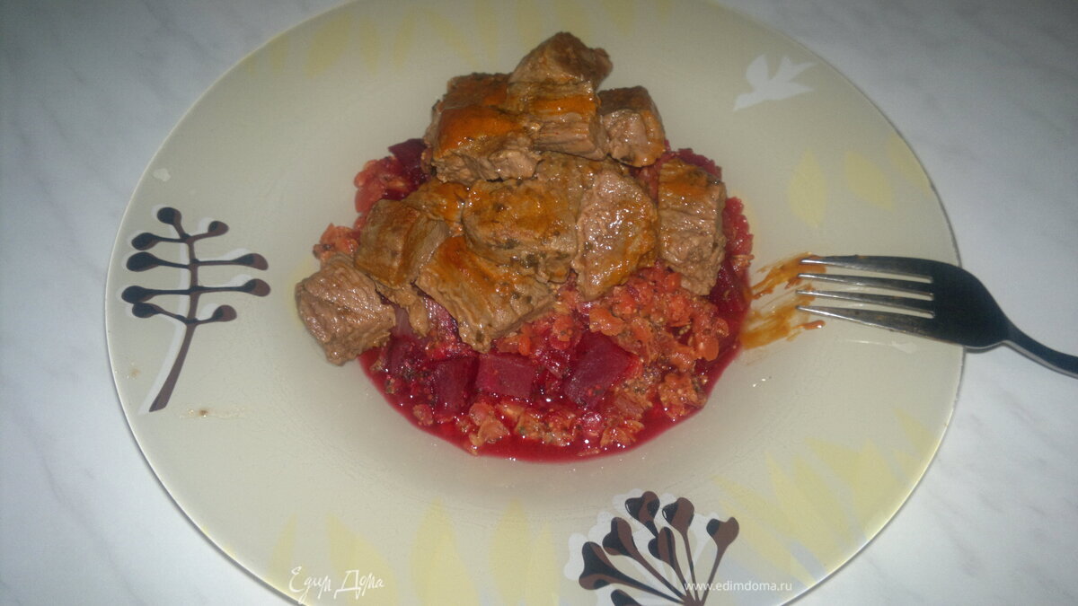Чечевичная похлебка вариант два ( со свеклой, луком и горчицей ) + говядина тушеная в томатно-перечном соусе.