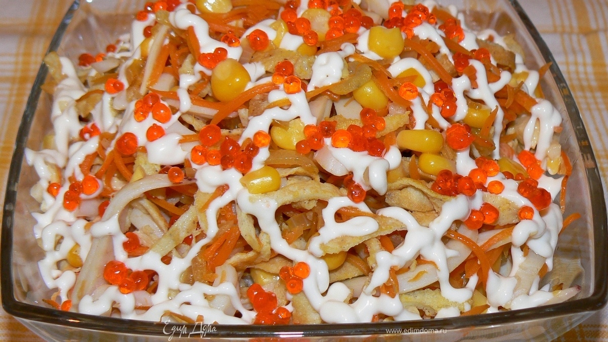 Добавить зубчик чеснока через пресс. Яблоко очистить от шкурки,нарезать маленькими кубиками. Все ингредиенты соединить, перемешать, добавить консервированную кукурузу (без жидкости) и заправить майонезом. По желанию - соль,перец. Украсить зеленью.(или по желанию) Приятного аппетита!!!