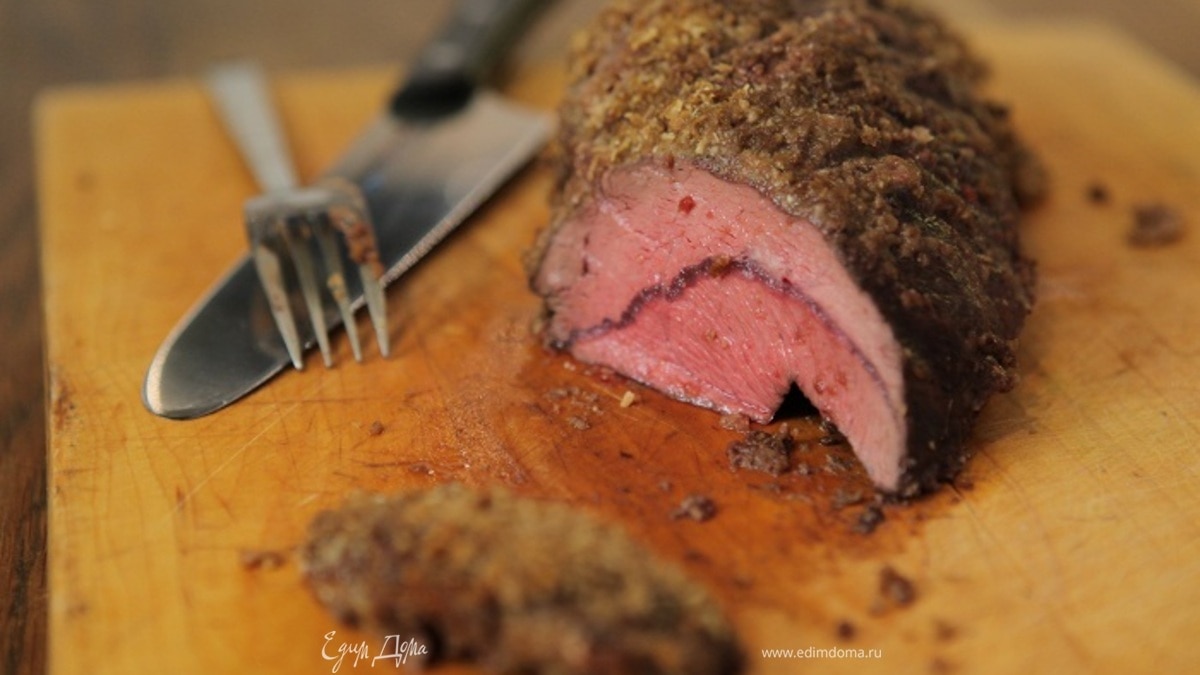 Мясо натереть маринадом, сложить вдоль пополам, скрепить зубочистками или завязать пищевой нитью и обвалять со всех сторон в хлебно-пармезановой крошке. - Шаг 7