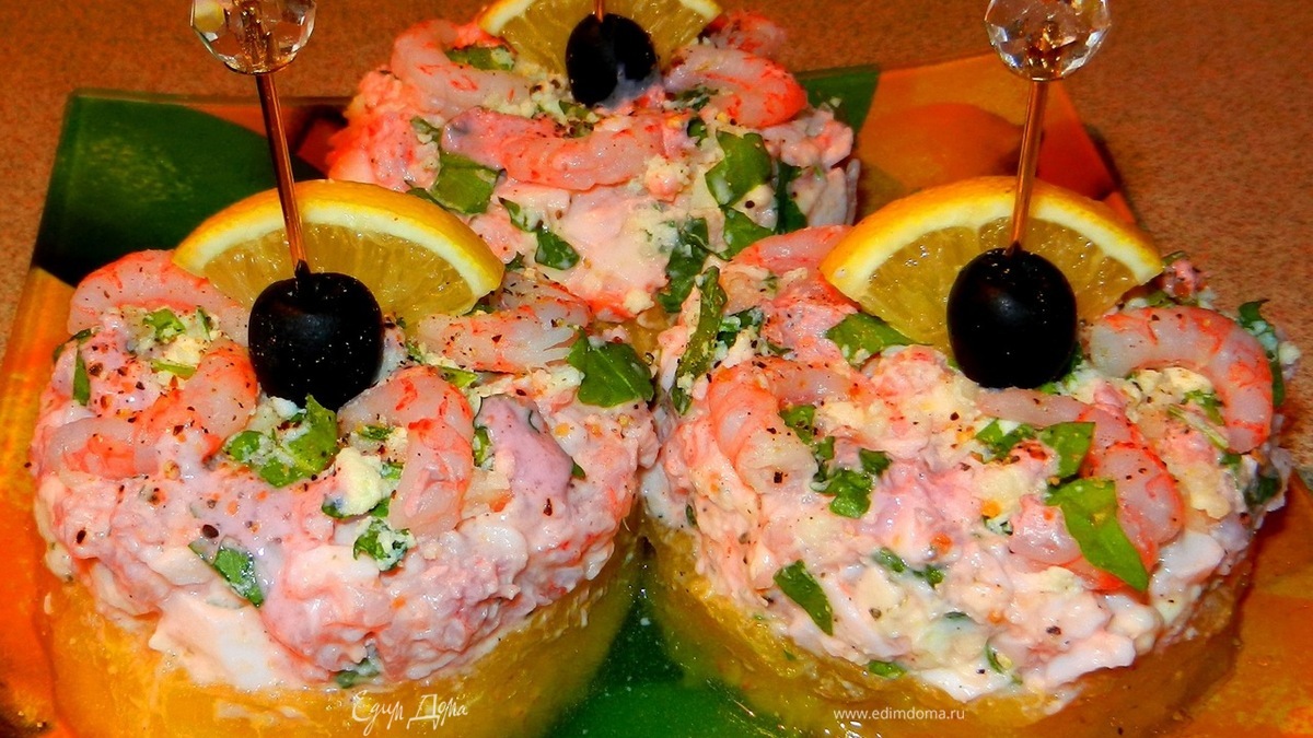 - Шаг 1Креветки разморозила, сбрызнула соком лимона и оставила на 15 минут.. Порезала небольшими кубиками яйца, плавленый сыр, рукколу, соль , перец. Добавила туда порезанные креветки (часть оставила на украшение). Для заправки смешала йогурт с винным уксусом, томатной пастой и выдавленным чесноком. Выложила получившуюся закуску на кольца ананаса. У меня был свежий, но можно использовать консервированный, я так думаю…