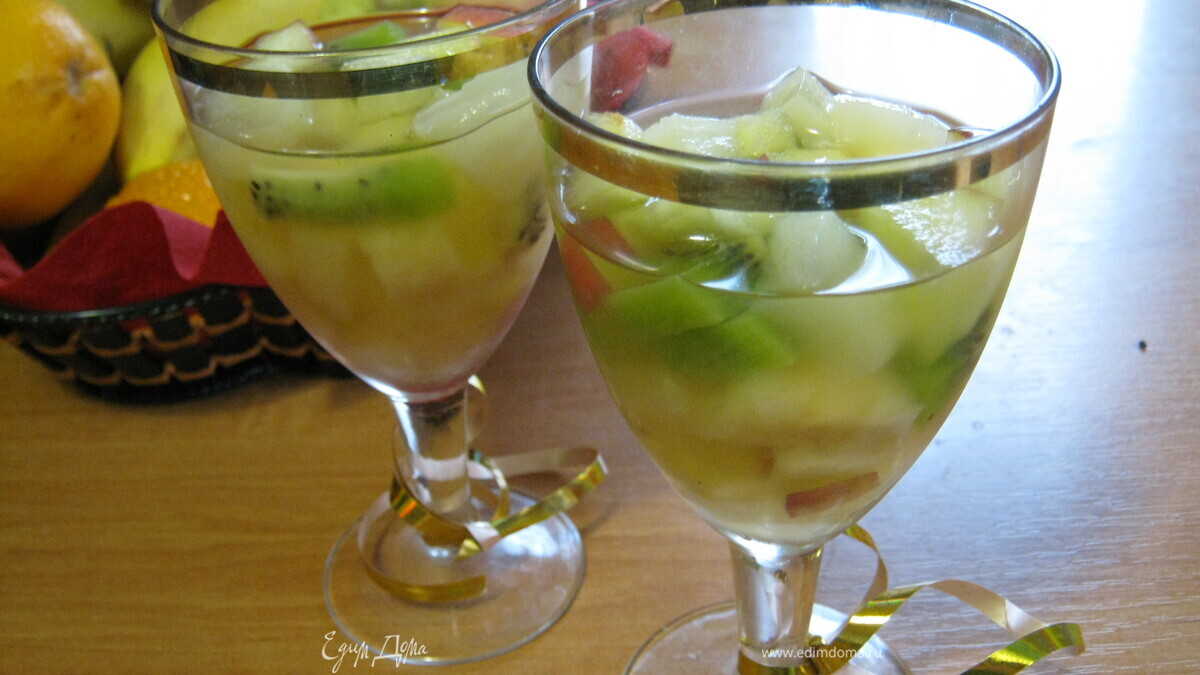 - Шаг 1В ананасовом соке распускаем желатин. Если не сильно разбух можно отправить в микроволновку на пару секунд, чтоб он дошел. Фрукты нарезаем кубиками и отравляем в бокал. Заливаем нашим соком и отправляем в холодильник на пару часиков. В этом десерте можете использовать разнообразные фрукты и соки на ваш вкус. Приятного аппетита!