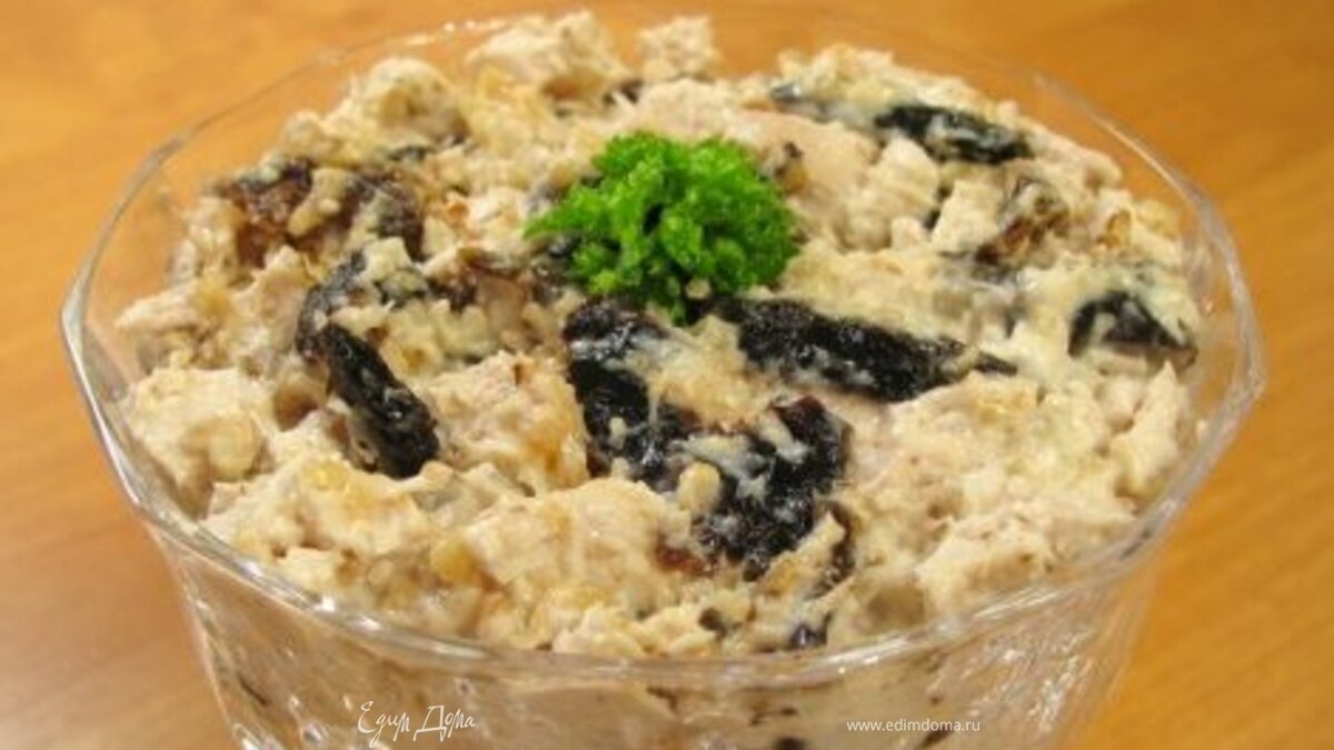 - Шаг 1Отварить куриную грудку. Остудить. Порезать на кубики. Порезать чернослив на кубики. Фундук, миндаль или грецкий орех пождарить и порубить на кубики. Всё перемешать и заправить майонезом смешанным со сметаной в пропорции 50 на 50. Приятного аппетита!