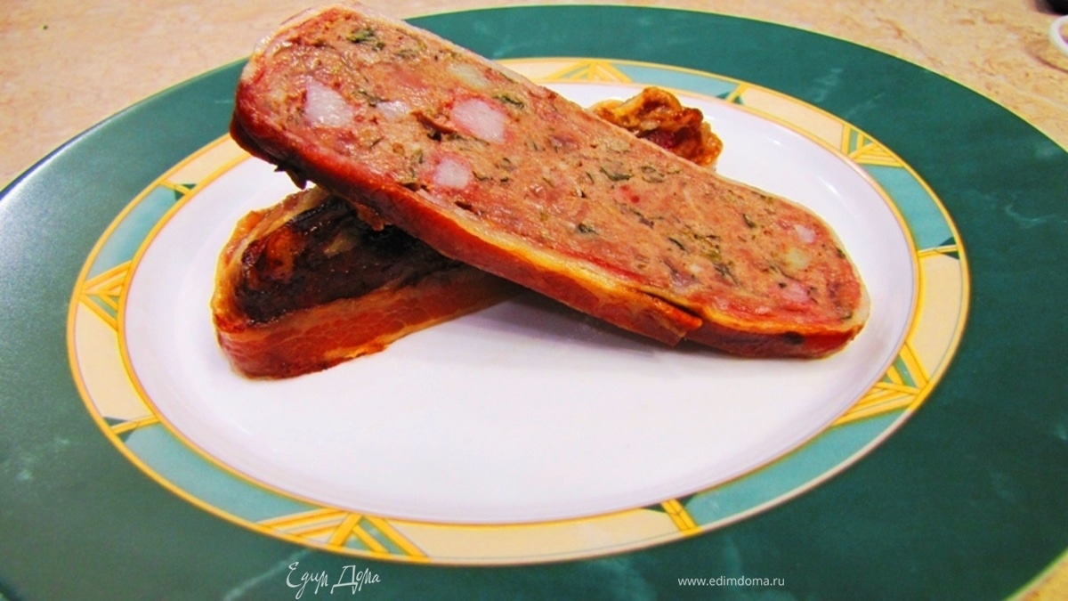 Перемешайте хорошенько. Возьмите прямоугольную или другую форму такого размера, чтобы весь фарш поместился в нее. Выложите бекон таким образом, чтобы он полностью закрыл дно формы, причем оставшиеся части смогли закрыть фарш сверху (см. фото). Торцы формы закройте двумя полосками бекона соответствующей длины.