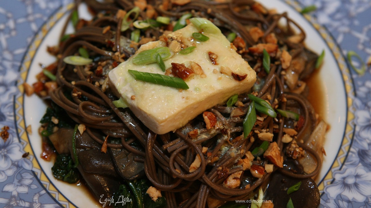 На тарелку выложить грибы со шпинатом, лапшу, сверху поместить обжаренное тофу, посыпать все измельченными орехами и полить заправкой. - Шаг 11