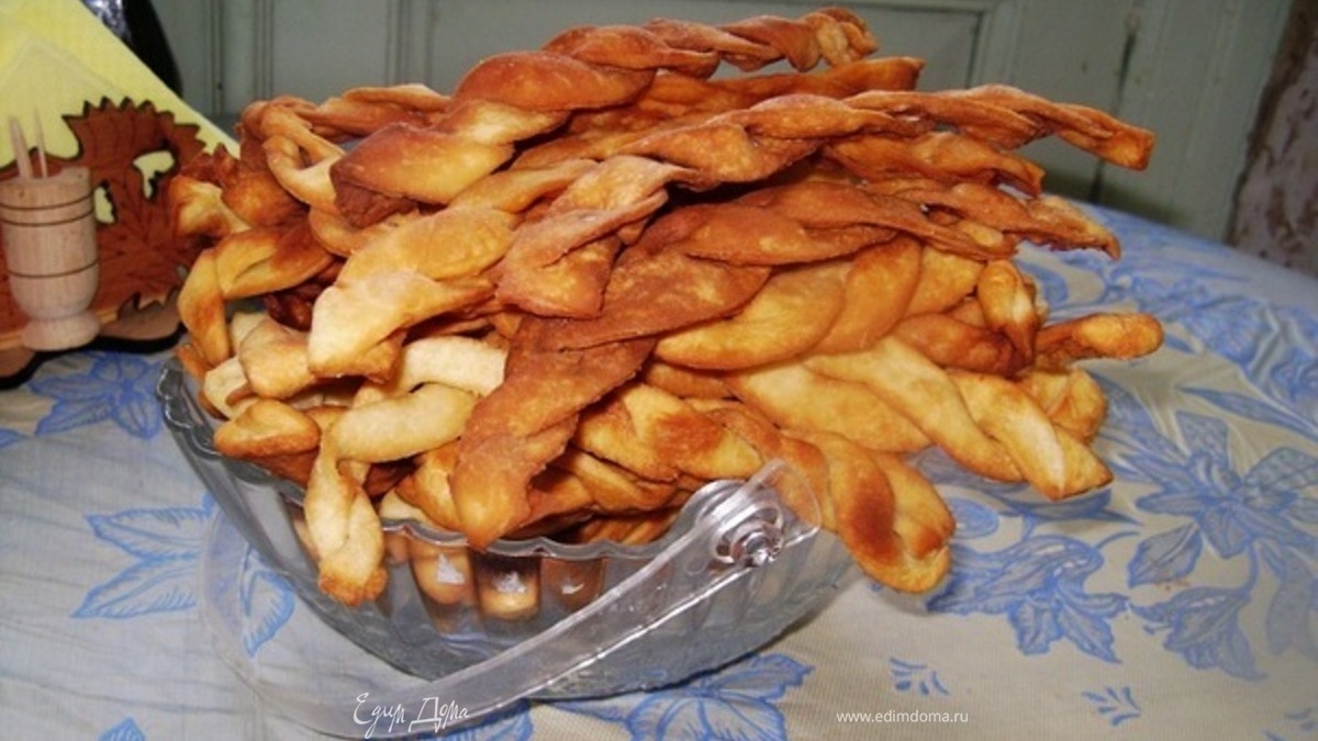 - ПодготовкаПросеянную муку высыпать горкой на стол и сделать в центре ямку, в нее влить смесь, состоящую из яйца, молока, сметаны, сахара, соли, 1 ст. ложки растительного масла. Начиная с центра, жидкость постепенно смешивать с мукой так, чтобы получился комок крутого теста. Его тщательно вымешать, накрыть тканью и оставить на час. Затем тест основа выбить и тонко раскатать, как на лапшу, нарезать полоски длиной около 10 и шириной 4-5 см. После этого две плоски теста переплетают и кладут в горячее масло на сковороду. Подавать к столу, посыпав сахарной пудрой или медом.