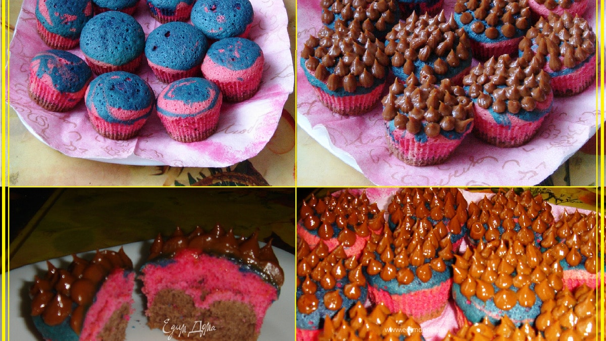 В формочки для кексов вложить бумажные юбочки и разлить тесто: ст.л. коричневого теста→посыпать мускатным орехом→дес.л. розового теста. Затем в 1/3 розового теста добавить немного синего красителя и вылить остатки теста по формочкам (приблизительно по 2/3ч.л.). - Шаг 5