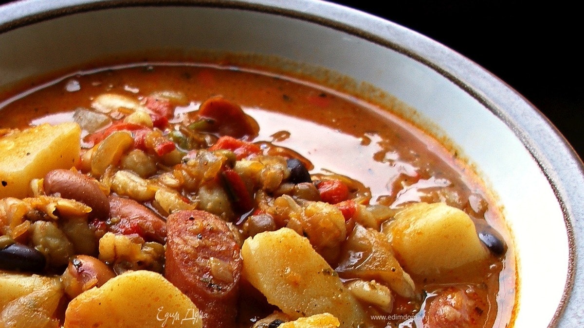 Я этот супик готовлю в мультиварке REDMOND за 1 час, но без колбасок, вместо колбасок добавляю филе говядины кубиками. Вот мой рецепт: Меню мультиповар 120Град, 5 мин. обжариваю морковь и лук, затем добавляю мясо и помидоры черри, продолжаю обжаривать еще 5 мин. После меню СУП, заливаю водой (около 1 л), добавляю картофель и смесь чечевицы с фасолью (красной и белой), также приправу и ставлю на 1 час варить. Ну очень вкусно.😜 СПАСИБО ЗА РЕЦЕПТИК