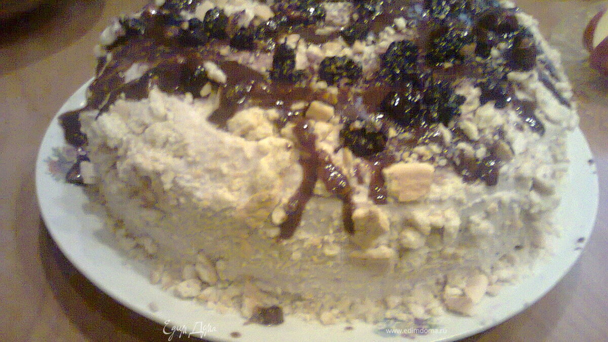 - Шаг 1смешать хорошо творог, сыр, йогурт, сахар. Разрезать корж на 2 части. Половину полученной массы на 1 часть бисквита, разровнять. Накрыть 2 частью бисквита, выложить оставшуюся часть массы, разровнять, обмазать бортики.Затем раскрошить печенье.(У меня орехов не оказалось). Растопить шоколад плитку всю и 1 ст.л. масла сливочного, полить на торт и на 3 часа в холодильник. Торт готов