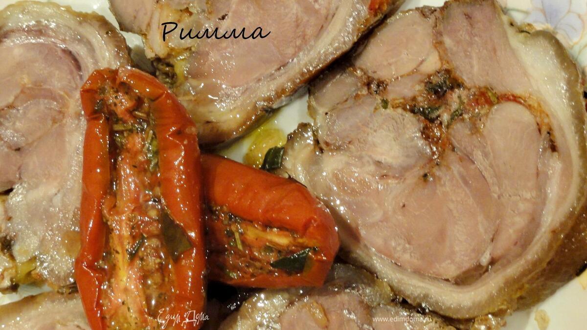 Чеснок выдавите с помощью пресса. Вяленые томаты очистите от кожицы. Положите рульку на доску кожей вниз. Смешайте специи с томатами и чесноком, хорошенько разотрите. - Шаг 6