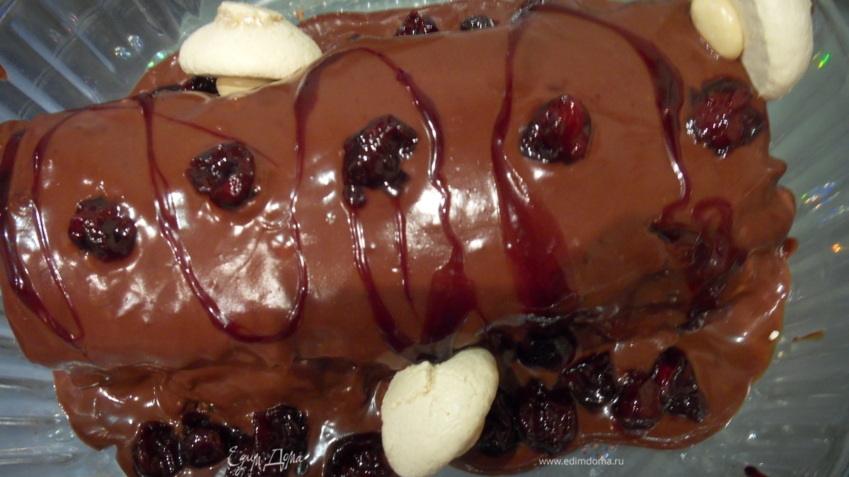 - Шаг 8Глазурь: Растопить шоколад, добавить теплое молоко и сахар(100гр.)Охладить. Добавить сметану. Полить рулет и оставить минимум на два часа. Украсить по желанию( у меня вишни в коньяке и безе)